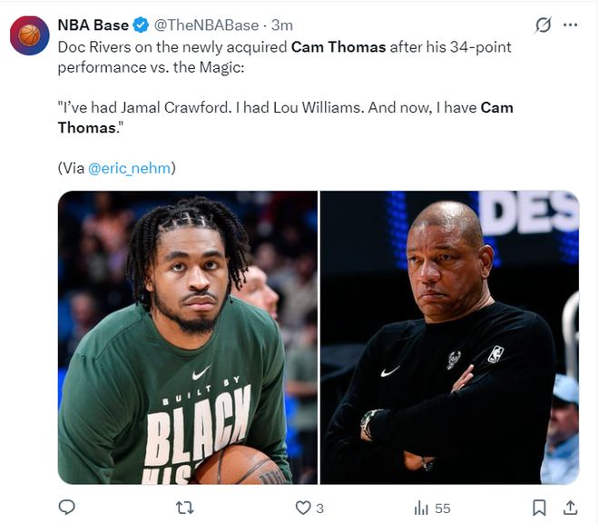 赛后雄鹿主帅道格-里弗斯说道:很高兴我们能签下托马斯,正如我当年的球队中有贾马尔-克劳福德与路易斯-威廉姆斯一样,托马斯就是我们的最佳第六人。