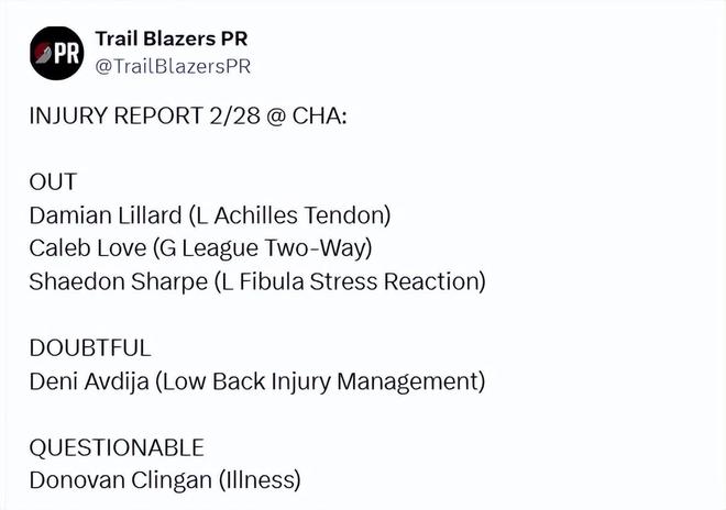 开拓者最新的伤病名单显示,明日对阵黄蜂,利拉德、乐福、夏普是缺阵状态,阿夫迪亚因背部伤病管理大概率也不打,生病的克林根出战成疑。杨瀚森和罗威都不在伤病名单中。罗威上一场比赛得到14分14篮板2抢断4盖帽的全面数据,瀚森DNP,没有获得出场机会。