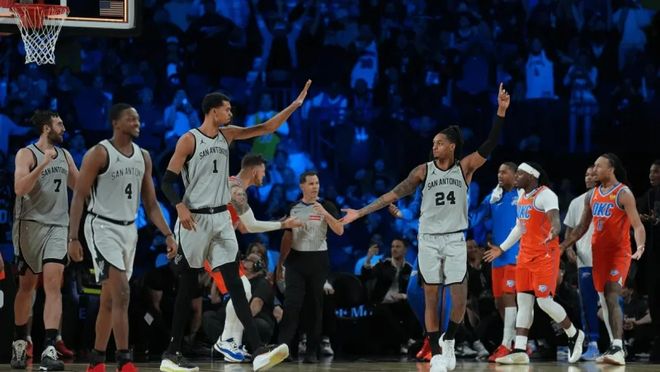 换句话说,只要文班在场上,马刺这两个月就没输过球。 今天这场,过程跌宕起伏。首节文班带队领先,他一下场太阳就反超。次节太阳一度领先两位数,文班回来稳住局面。三节打完太阳还领先6分。 末节福克斯找到手感,联手文班疯狂追分。最后时刻,球在文班手里,所有人拉开,他面对防守,中距离出手,球进灯亮。