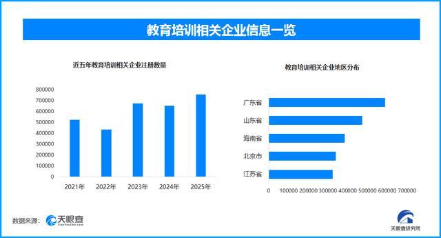 天眼查的股权全景穿透图与股东信息功能成为研学产业价值筛选的重要工具。在产业整合过程中,投资者通过股权全景穿透图可清晰掌握企业的股权结构与资源关联,评估其核心竞争力与发展潜力,推动优质资源向头部企业集中;对于学校和家长而言,查询研学机构的股东背景,可了解企业是否具备实力雄厚的背书,判断其服务品质与可靠性,让研学旅行的教育价值得到更有力的保障。 教育补习:合规引领与素质转型并行,赋能青少年全面成长 “双减”政策常态化背景下,寒假教育补习市场完成了深刻的价值重构,从过去的 “应试提分”转向“素质赋能”的高质量发展轨道。 如今,家长的教育需求更趋理性,不再盲目追求学科成绩的短期提升,而是更关注孩子的兴趣培养、能力提升与个性化发展,这种转变直接推动了素质教育赛道的崛起,成为寒假教育补习市场的核心增长动力。 行业的合规化进程为教育补习的价值落地提供了制度保障。相关部门持续强化监管力度,规范市场秩序,打击违规办学行为,引导行业回归教育本质。在合规化的大趋势下,具备完善资质、优质师资与科学课程体系的机构得以持续发展,而缺乏核心竞争力的小作坊式机构逐渐被市场淘汰,行业集中度不断提升。 同时,科技赋能成为行业升级的重要驱动力,智能教学工具的应用与个性化教学方案的推出,让教育补习更具针对性与效率性,更好地满足了学生的个性化成长需求。 天眼查专业版数据显示,截至目前我国现存在业、存续状态的教育培训相关企业超533.7万家。其中,2025年新增注册相关企业约75.8万余家,从企业注册数量趋势来看,近五年间,教育培训相关企业的注册数量大体呈现出增长态势,并在2025年达到顶峰。 从区域分布来看,广东省、江苏省、山东省教育培训相关企业数量位居前列,三个省市数量总和超过4800家,占企业总数的41.5%。