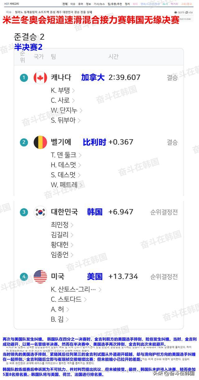 韩网友评米兰冬奥会短道速滑混合接力韩国队因美国队摔倒无缘决赛