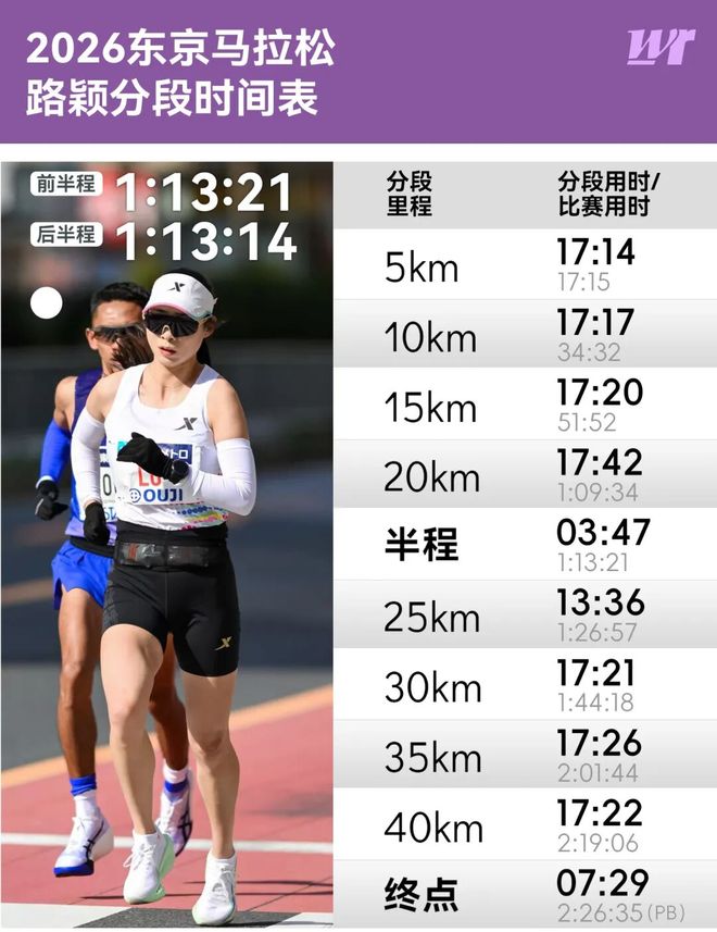 虽然PB,路颖仍有未完成的目标。 毕竟来之前预计225完赛的目标还未实现。董俊峰一直觉得,中国不少女选手有打开225的实力。这其中,就包含了他的弟子、两次站上全运会马拉松领奖台的路颖。 “就算PB,但心里还是蛮难受的。因为感冒,没把最好水平发挥出来。不过有一点,最起码我上场,也PB了。所以也没必要再纠结结果了。”坐在酒店楼下的餐厅里,路颖边聊边劝诫自己,要“想得开”。她心里想着是,如果没感冒这个意外状况,教练要求的配速要比现在快。但也可能配速要求太快,万一后面跑不过来……” 而董俊峰赛后则说:“这是场略有遗憾的比赛,如果我跟着去可能会好些。不过也行了,人生哪有那么完美。” 2025年3月在无锡热战中,路颖当时创造了2:27:30的PB。如今,经历一年沉淀,她把PB提升了55秒,历经两届全运淬炼后,再次提升硬实力。不过,她也说两次创造PB时,自己的状态都不是很好,“无锡PB的那场比赛,中途肚子不舒服,还因上厕所而耽误时间。”这一次,队友徐冰洁同样在25公里处,因为难受中途找厕所,但当时赛道旁没有,所以徐冰洁不得已去到赛道外的附近地铁站里的厕所,这个插曲也导致她最终完赛时间在2:34:26。 路颖说,自己刚入省队时懵懵懂懂,当时一心想能上个大学就好。后来,随着比赛经历的增多,人生经验的丰富,已完成大学学业的她如今的心愿是“跑个好成绩”。她对好成绩的界定是225-223。路颖不知道未来两三年,能否实现这样的高度,但她想试试,“我们相信教练,教练也相信我们”。 前些年东京马拉松比赛时,路颖说自己也会趁着训练调整的间隙,拿着手机看直播,边看的时候边想——什么时候我也能参加一次东马,如今梦想真的实现了。接下来,回国后的她要调整状态,准备两周后的仁寿了。 自评此次东马表现为80分的路颖说,“等我状态更好的时候,希望能跑的更好”。 本条内容创作团队 作者:WR China Team 制作:东海、小春 图片:品牌官方、受访者提供 投稿、应聘兼职作者,请联系 womenrunning@163.com