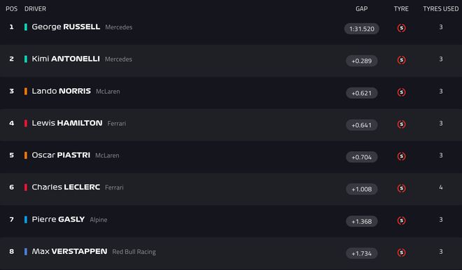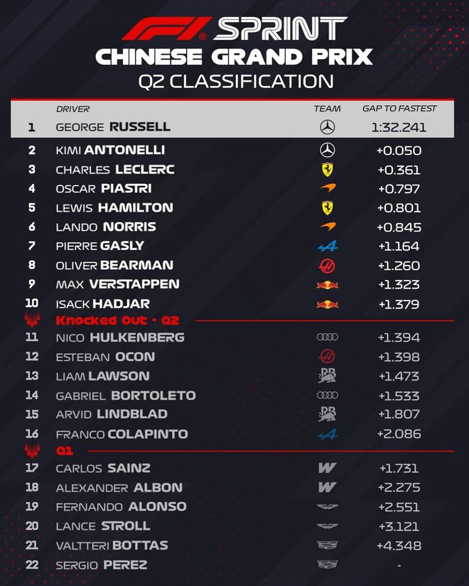 2026F1中国站冲刺排位赛今天下午结束争夺,在一练表现亮眼的梅奔车队彻底不演了,拉塞尔以1分31秒520获得冲刺赛的杆位,安东内利排在第二,诺里斯位列第三。诺里斯与拉塞尔的差距达到了0.621秒,今年的梅奔两台车实在是太快了……第四到第十依次是汉密尔顿、皮亚斯特里、勒克莱尔、加斯利、维斯塔潘、比尔曼、哈贾尔。 SQ1结束:塞恩斯、阿尔本、阿隆索、斯特罗尔、博塔斯、佩雷兹被淘汰 SQ2结束:霍肯博格、奥康、劳森、博托莱托、林德布拉德、克拉平托被淘汰 本周F1中国站,五星体育将全程直播!
