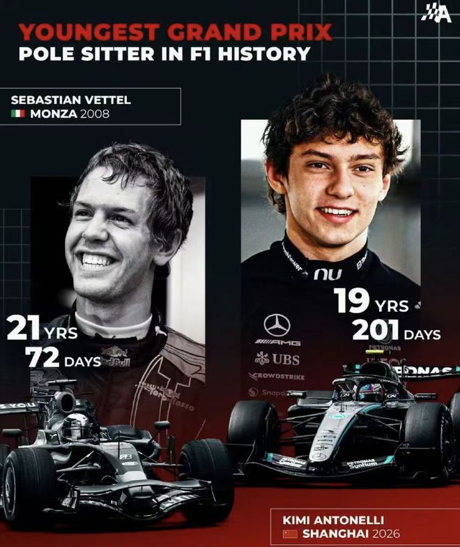 刚刚结束的#2026F1中国大奖赛 排位赛中,梅奔车手安东内利获得F1职业生涯的首个杆位。就此,他以19岁201天的年龄超越瓦特尔(21岁72天)成为F1历史上最年轻的杆位获得者!恭喜“小kimi”安东内利! 而随着排位赛的结束,明天的正赛排序就此出炉!梅奔、法拉利、麦克拉伦三强占据前三排!3月15日下午14点30分,五星体育将为您直播2026赛季F1中国大奖赛正赛!敬请关注!#赛车界的新星 #F1 #梅奔F1 #法拉利 #汉密尔顿 #勒克莱尔 #安东内利 #拉塞尔