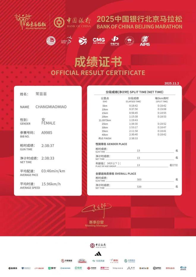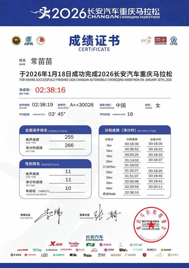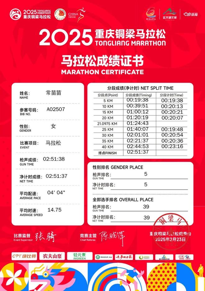赛后才知道赛道有500多米海拔 苗苗说难怪自己跑着觉得浑身软软的 这是苗苗正式接触马拉松的第三年——2023年10月的黄山马拉松,还在读大三的她用334交出了首马答卷。首全马的挫败感,让她把精力一度全部转向了越野。直到去年上半年,她才在铜梁开启了第二场全马之旅,在这场比赛中,她将全马成绩跑到了251;下半年从高原夏训完,她更是势如破竹,在北京马拉松一举跑出2小时38分,拿下国内女子第五,达标国家健将。三年里,全马成绩从334到238;半马从128到115。总是好像跑在一根弦上的苗苗,在这条路上走得很快,但也走得很紧。