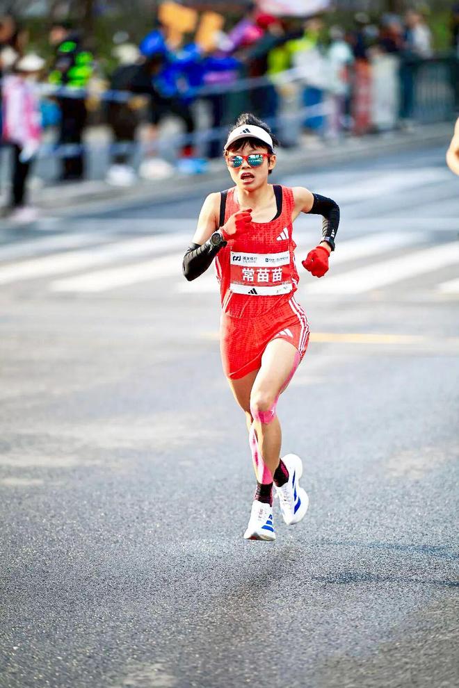 常苗苗憋着劲,连跑了两场上海半马,今年比去年快了近4分钟。 进步如此之快,大家都对她说:“你真棒!”苗苗也对自己说:“我真棒!” 去年上海半马前一天,常苗苗在浙江尤溪跑了一场25K越野,拿了女子组第一。第二天她就“野转路”背靠背出战上海半马,以119的成绩完赛,排在国内女子第九位,无缘前八。 今年上海半马,完成冬训计划的苗苗有备而来,目标是跑进115,争进国内前八。渐加速的作战策略,让她前程跑得很顺,直到近17公里后的上坡,才让她戴上了痛苦面具,“博凯学长带着我跑,但他一加速,我就跟不上了,只能自己往下顶。”幸运的是,一直跟随的旧伤并没有发作,腿只是略微有点紧,并未出现两周前比赛中快要抽筋的预兆。 1小时15分18秒,国际第七,国内第五。穿着一身红色战袍,戴着黑色臂套的常苗苗大口呼吸着,将自己的半马PB提升了1分04秒,达标国家健将。