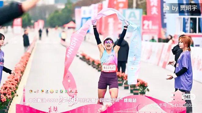 苗苗跟训练营的伙伴们 在丽江体育场合影 跟A组男队员一起训练,每一次的突破都让她更自信 但临近冬训结束前一周,右腿胫骨炎的再次侵袭以及左腿后侧代偿引发的右腿下肢水肿也让她一度恐慌。停跑、按摩放松、康复理疗、交叉力量训练,差不多三天之后,她又开始恢复跑步。 就这样带着伤,从丽江冬训结束下山的苗苗,在3月1日的江油马拉松中以1:16:21拿下了半程组的女子第一,将自己的半马PB提升了28秒。她向来“慢热”,属于比赛后期越跑越容易出成绩的类型。作为开春下山后的首场适应赛,她想着“先下山跑一跑,能发挥出最佳状态最好”。 虽然比赛前程跑得很顺利,但14-15公里后,一直伴随的伤病开始发作——左腿越跑越紧,右腿随时有抽筋的预兆,跟一月中旬重马那场如出一辙。她不敢加速,只想着调整状态完赛。直到最后一公里,她感觉还有余裕,又想到离116不远了,她才冲刺了一把。加速、微笑、冲线前,她张开双臂比了个心。鞠躬、与队友握手,虽未达成跑进115达标国家健将的短期目标,但“保住了名次”。赛后她在社交媒体上开心地分享,“最后跑得很畅快,没带痛苦面具。”