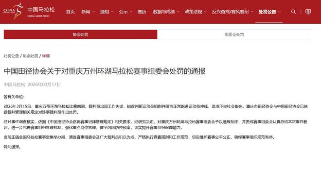 中国田径协会关于对重庆万州环湖马拉松赛事组委会处罚的通报 各有关单位: 2026年3月15日,重庆万州环湖马拉松比赛期间,裁判员出现工作失误,错误判断运动员组别并阻挡正常跑进运动员冲线,造成不良社会影响。重庆市田径协会与中国田径协会已依据裁判管理相关规定对涉事裁判员作出处罚。 经对事件调查核实,依据《中国田径协会路跑赛事纪律管理规定》相关要求,经研究决定,对重庆万州环湖马拉松赛事组委会予以通报批评,并责成赛事组委会认真总结本次事件教训,进一步完善赛事组织管理机制,强化重点岗位管理,健全风险防控预案,切实提升赛事组织保障能力。 当前正值全国马拉松赛事密集举办期,请各赛事组委会及广大裁判员引以为戒,严格执行竞赛规则和工作规范,切实维护赛事公平公正,确保赛事组织规范有序。 特此通报。