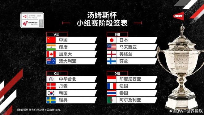 (图片来自世界羽联) 2026汤姆斯杯小组赛签表 A组:中国、印度、加拿大、澳大利亚 B组:日本、马来西亚、英格兰、芬兰 C组:中国台北、丹麦、韩国、瑞典 D组:印尼、法国、泰国、阿尔及利亚