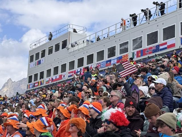 意大利科尔蒂纳托法内高山滑雪中心观众席《华夏时报》记者石文君/摄 场外:闪耀的冰雪小镇,闪耀的“世界人” 我们居住的酒店位于科尔蒂纳丹佩佐(下称“科尔蒂纳”),这是一个名副其实的冰雪小镇,坐落于阿尔卑斯山脉,被冰雪环绕,所有的旅游服务都是围绕冰雪运动展开的。 每天我们都迎着朝阳奔赴赛场,阳光照在雪上,每一粒雪都被照得闪闪发光。除了树木和天空,目光所及之处都是白色,汽车顺着盘山公路,在这座“冰雪王国”往返,无比治愈。 在科尔蒂纳美丽的外表之下,还藏着多变的天气。盘山公路每一处拐弯遇到的天气都不一样,第一道拐是小雨,下一道拐就是大雪,翻过四五个拐后,又是一片大晴天。 或许是受到了环境的影响,科尔蒂纳的每一个餐厅、小店的外观都装修得精致美丽、极具艺术性,但是店内陈列的商品和食物,都有着很明显的特色,就像科尔蒂纳多变的天气,多姿多彩,为到来的每一个顾客展示着意大利的魅力。 除了热爱冰雪运动的游客,这次米兰冬残奥会让来自全世界的人都有机会感受科尔蒂纳的美景和风土人情,科尔蒂纳变成了临时的“世界村”,小镇的酒店和民宿挂着各国国旗,以及米兰冬残奥会特色旗帜,世界各地的文化、语言、饮食等在这里汇集,当地人热情地跟每一个到来的人热情打招呼说:“CIAO(你好)!”虽然语言不通,但大家都能感受到对方的友好和热情,“地球村”在一次次沟通和交流中,得到了具象化的体现。