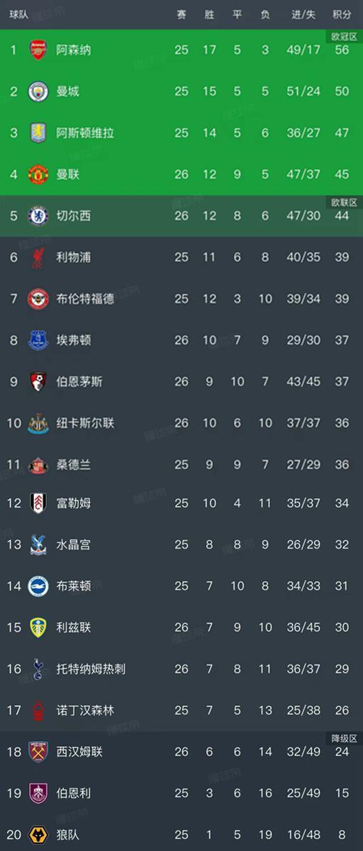 北京时间2月11日,随着曼联1-1西汉姆联、切尔西2-2利兹联、热刺1-2纽卡斯尔联,埃弗顿1-2伯恩茅斯的比赛结束,英超第26轮率先结束了4场,最新排名如下!