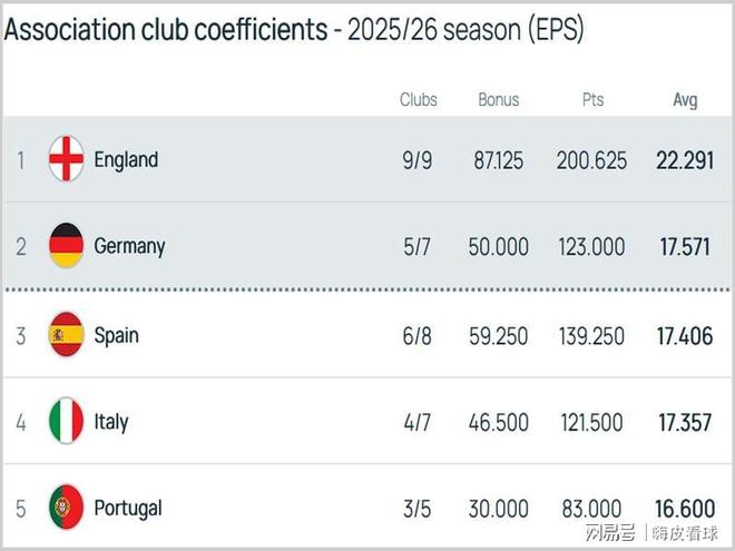 根据积分计算规则,来到淘汰赛阶段,奖励部分的分数,相对于欧联杯和欧协联,欧冠权重优势并不会太大,积分增长主要看比赛的胜负。意甲如果不能在欧联杯和欧协联同时闯进四强的话,基本上就很难争夺欧洲联赛积分的第二名。 英超基本锁定欧洲前两名,下赛季还会拥有一个欧冠的奖励名额,对于曼联、切尔西和利物浦,甚至阿斯顿维拉来说,4支球队将争夺3个欧冠席位,难度会降低不少。另外一个欧冠奖励名额,相信会从德甲和西甲中产生,西甲后来追上的机会应该更大一些。 |